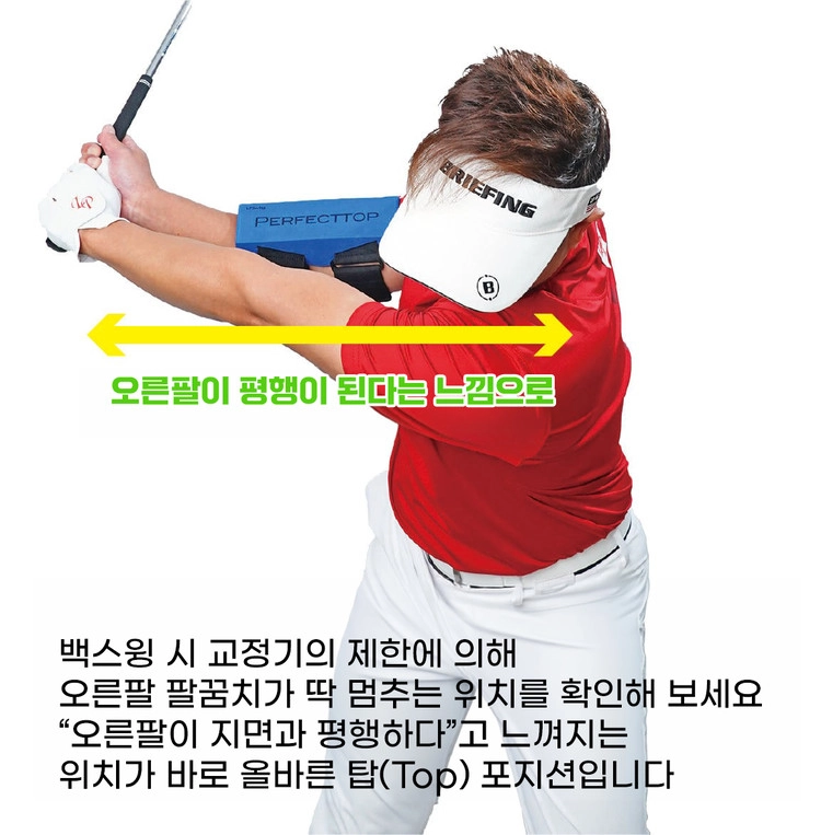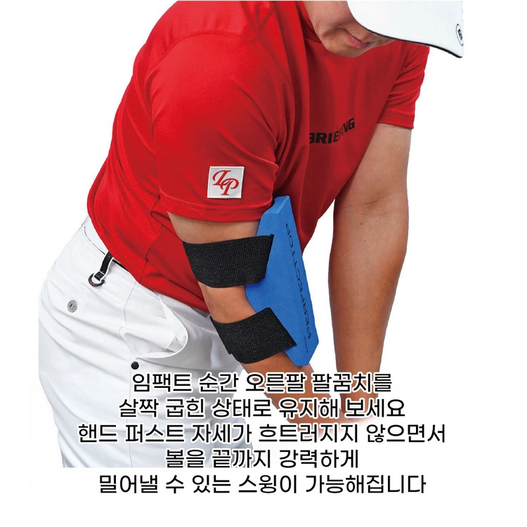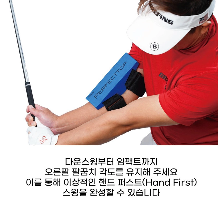 사용법은 매우 간단합니다. 오른팔꿈치 안쪽에 본체를 세팅하고 백스윙을 하는 것만으로도 기구의 물리적 제한을 통해 왼팔이 지면과 평행을 이루는 ‘이상적인 탑 포지션’을 자연스럽게 체득할 수 있습니다. 이렇게 유지된 오른팔의 각도를 다운스윙부터 임팩트까지 그대로 가져가면 프로들의 전유물인 ‘핸드 퍼스트(Hand-First)’ 임팩트가 실현됩니다. 파워 손실을 막고 비거리와 방향성을 극적으로 향상시켜 주는 ‘퍼펙트 탑’으로 당신의 스윙을 한 단계 더 진화시키세요