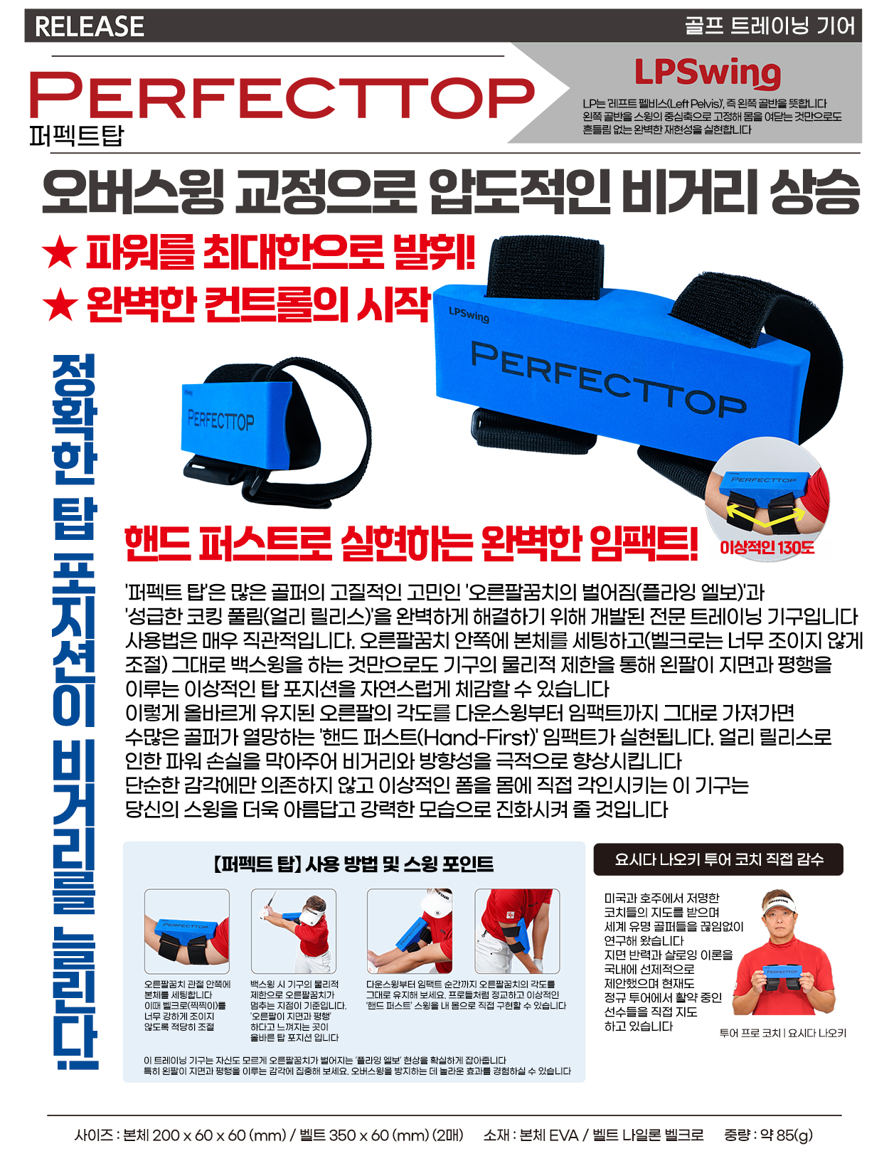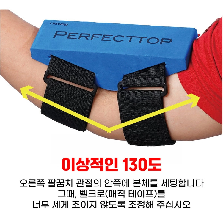 '퍼펙트 탑’은 많은 골퍼들의 고민인 ‘오른팔꿈치의 벌어짐(Flying Elbow)’과 ‘얼리 릴리즈(Early Release)’을 해결하기 위해 탄생한 트레이닝 기구입니다.